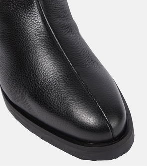 These black leather ankle boots mirror the technical style at the heart of our new winter collection. Like a pair of hiking boots, these are perfectly snug, fasten with laces and feature a small, matching fabric tab at the back. The thick notched soles provide extra height and make them stand out. Be bold by teaming these flat ankle boots with a short printed skirt, a white shirt and a wool suit jacket.