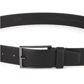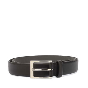 This black leather belt is a fine, timeless accessory that’ll cinch all your favourite trousers. Made from dark calfskin, it’s dotted with silver rivets all the way along and has an aged-effect metal buckle. For that subtle brand-signature finish, our brand name has been delicately engraved at the front. Thread this belt through the loops of a pair of grey suit trousers, worn with a printed shirt, fitted jacket and Oxford shoes. S