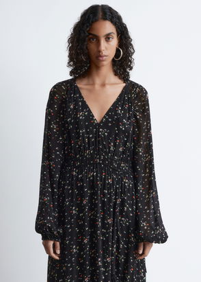 Modern and romantic, this light floral dress is a must-have from the Spring 2021 collection. We opted for a maxi silhouette with long, sophisticated sleeves accentuated by frills at the shoulders and cuff ties. The silver flowers against the black background, on top of the small covered buttons down the front, brighten it up. This printed dress can be worn with a an oversized jacket and sandals.