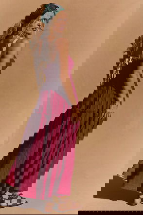 This long, flowing dress mirrors the rustic, rural feel of spring with its fresh, radiant printed motif. With slits at the bottom, thin sleeves with ties and a row of discreet buttons down the front, it’s sculptural in style. It’s embellished with our new collection’s signature motif: small flowers against a blue background. Wear this dress with a denim jacket and western-style boots to showcase its delicate pleating.