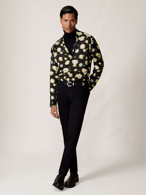 With its exclusive retro motif, this long black shirt revisits this season’s romantic theme in a subtle way. Made from flowing fabric, it features long sleeves with buttoned cuffs and a classic collar. As an alternative to the usual floral motif, we’ve embellished it with small irregular bouquets all over. Wear this slim-fit shirt with a pair of urban wool joggers and patent derbies to show off its modern style.