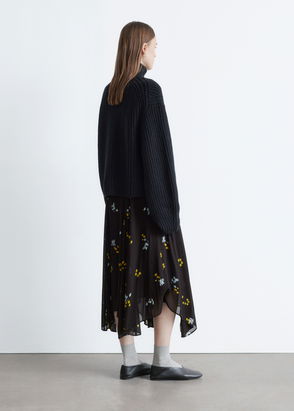 This long skirt with slit provides refined, elegant style that’s perfectly suited to work or weekends. Embellished with a micro tone-on-tone motif, the silky jacquard material gives it impeccable flow. The asymmetric shape is accentuated by light, floaty frills and small bright buttons at the side. To brighten up your outfit, team this vintage black skirt with an ecru lace blouse and a pair of lace-up sandals.