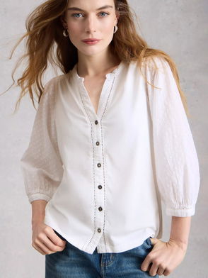 This long-sleeve ecru top by The Kooples combines structured style and ultra-feminine finishing touches. The light fabric gives it a flowing feel when worn and it’s enhanced by gathering at the shoulders and neck. A signature feature this season, the lace trims provide a graphic finishing touch and give the item a refined look. Shake things up by teaming this romantic embroidered top with high-waisted leather trousers, a fitted jacket and black heels.