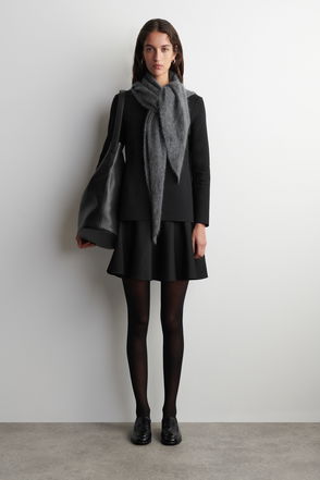 In keeping with the spirit of our new collection, this short black dress is quintessentially refined and romantic. The flowing dotted-Swiss fabric and semi-transparent lace inserts on the front offset one another, creating an elegant contrasting effect. The flounces on either side and at the bottom provide extra volume. You can wear this sophisticated dress as part of a simple outfit with its own knotted belt, a leather jacket and Chelsea boots.