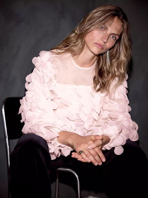 This light pink wrap top brings back the wraparound style, a contemporary silhouette that flatters all kinds of figures. It’s made from one of our new collection’s signature fabrics: light, floaty jacquard in a powder pink shade that will transport you to a boudoir from the 1920s. The gathering on sleeves and at the waist provide movement. Team this top with tapered suit trousers and heels.