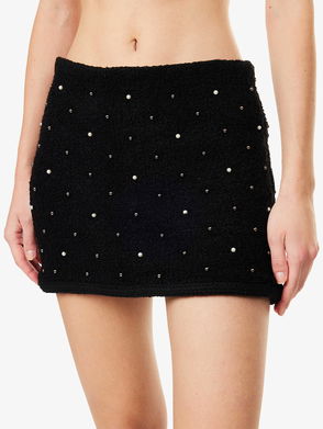This short, sophisticated skirt pays homage to this season's western trend while showing off your figure. We opted for fine and very soft wool fabric that delicately accentuates its structured style. The rows of silver studs around the edge at the top and bottom provide a radiant touch and brighten up the otherwise dark shade. Give in to the timeless style of this black skirt, and wear it with a fitted cotton shirt, a tweed jacket and boots.