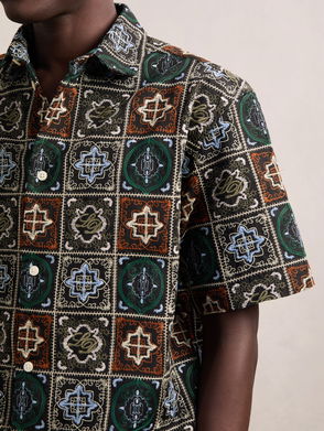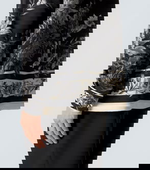 With its roomy fit and contrasting printed motif, this long black shirt provides sophisticated style. For an alternative to cotton, we opted for exceptionally soft silk embellished with small white cones all over. It has long sleeves with buttoned cuffs, a classic collar and a slightly curved hem. For a complete look, wear this chic shirt with grey jeans, a matching jacket and boots.