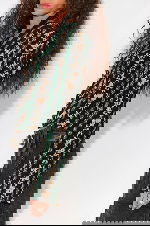 The exceptionally soft, pure silk fabric used to make this roomy top makes it perfect for giving work outfits extra refinement. The flattering silhouette is marked by small covered buttons down the front, puffed sleeves and a peplum at the bottom. It’s embellished with large orange flowers directly inspired by baroque art. Bring out the elegant style of this top by wearing it with a long pleated skirt and heeled boots.