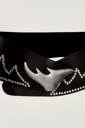 With its multiple, exquisite metal details, this women’s skinny belt offers a cross between accessory and jewellery. The item is held in place by the fine silver buckle at the front, which makes it perfect for enhancing more classic outfits. A great new addition from our new Summer collection, it features a chain that accentuates your waistline while providing a touch of rock style. For a timeless outfit, wear this leather belt with flowing trousers and a white cotton poplin shirt.