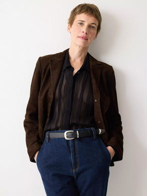 This skinny leather belt will accentuate your waist in a subtle way. With its smooth, slightly patinated material and long rectangular buckle at the front, this item puts refinement front and centre. The cut-outs provide a touch of originality and, in the same colour as the buckle, there are silver rivet studs at the sides. Give in to the timeless charm of this black belt, and wear it with basic raw jeans, a silk shirt and heeled sandals.