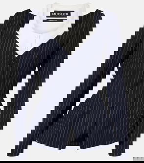 This season’s sporty style and classic tailored detailing combine to create this navy blue jacket. With its shoulder pads, pockets with flap at the sides and peak lapels, it has the structured style of a typical suit jacket. The dark background is subtly enhanced by thin white stripes inspired directly by men’s suits. Put elegance front and centre by wearing this striped jacket with a printed cotton shirt and a leather midi skirt.