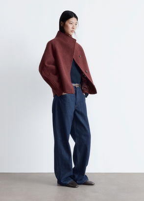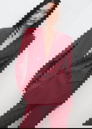 To set it apart and showcase our expertise, this burgundy formal jacket has an impeccable tailored cut. It’s made using the fine warm wool from our menswear range, enhanced by a tone-on-tone button fastening, large notched lapels and piped pockets at the sides. Darts and shoulder pads give the loose-fitting piece some structure. Give your business look a modern revamp by teaming this jacket with flared pants and loafers.