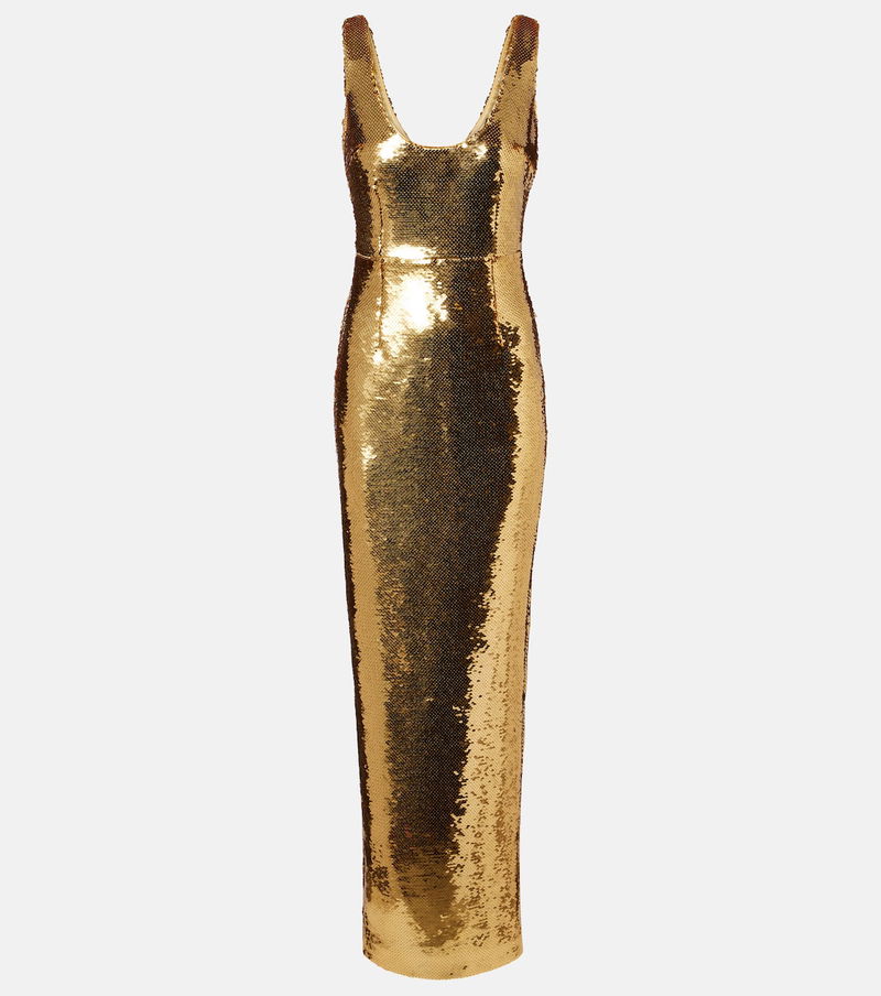Exude glamour in this gown from The New Arrivals Ilkyaz Ozel. The gold-hued design boasts a fitted silhouette with a scoop neckline, complete with shimmering all-over sequins.