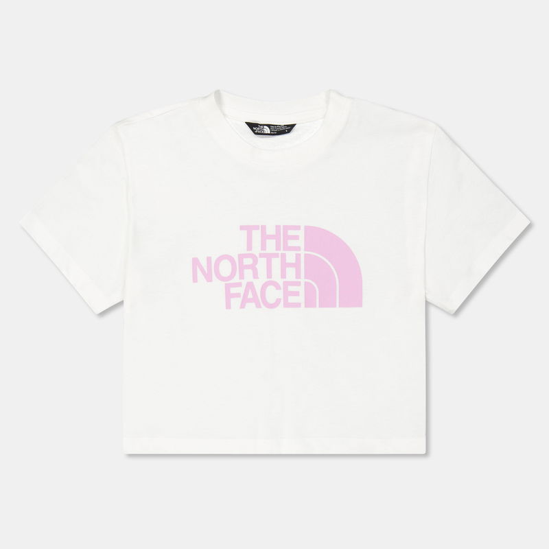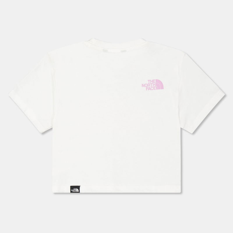 The North Face's Children's Short-Sleeve Cyber Berry Crop Top features a contemporary cropped cut balanced with an enduring build for active wear. The abbreviated profile delivers a modern aesthetic with short sleeves and The North Face's quality designed for youth.