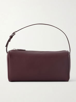 Polished nappa calfskin shoulder bag in beige. · Piping throughout· Adjustable shoulder strap· Logo embossed at side· Zip closure· Leather lining·
