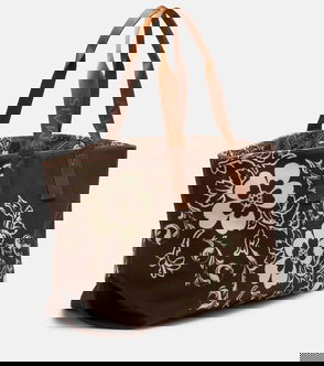 Square shape, double top handles, all-over striped print, all-over mesh texture, leather trims, detachable branded card holder