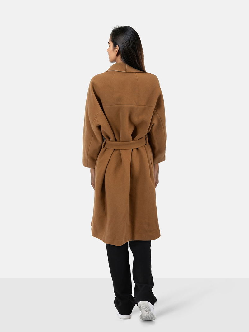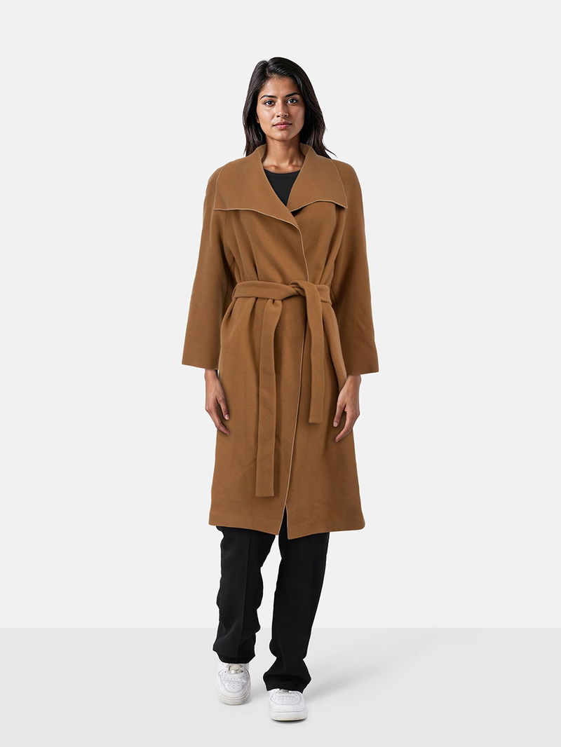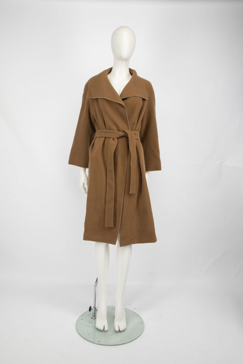 Tan wool belted coat in excellent, pre-worn condition. Mid-length, two side pockets, belt fastening.