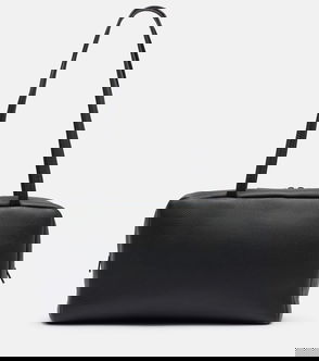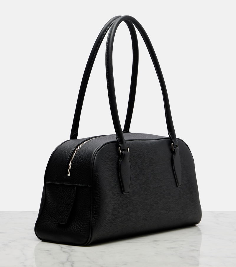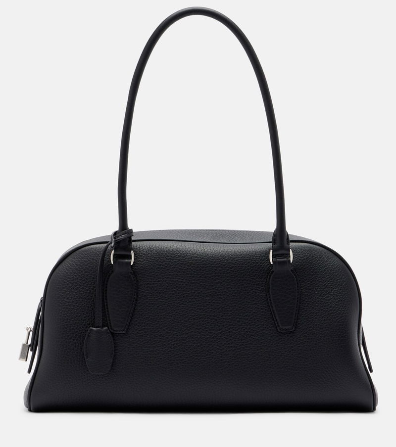The E/W India bag from The Row showcases a grained leather construction and signature streamlined silhouette. The design features a spacious interior, silver-toned hardware, and lengthy handles that double as shoulder straps.