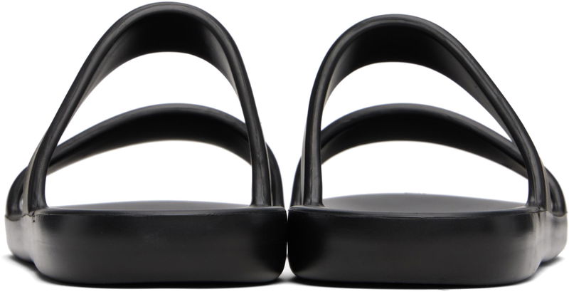 Lightweight foam rubber flat sandals in black. Open toe. Logo embossed at molded footbed. Treaded foam rubber sole.