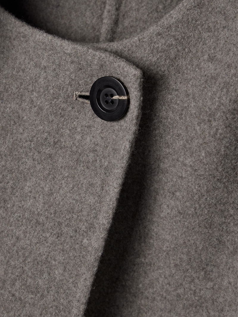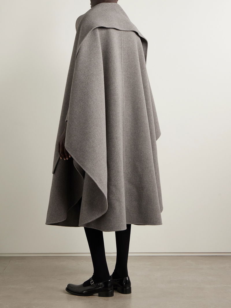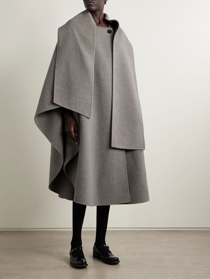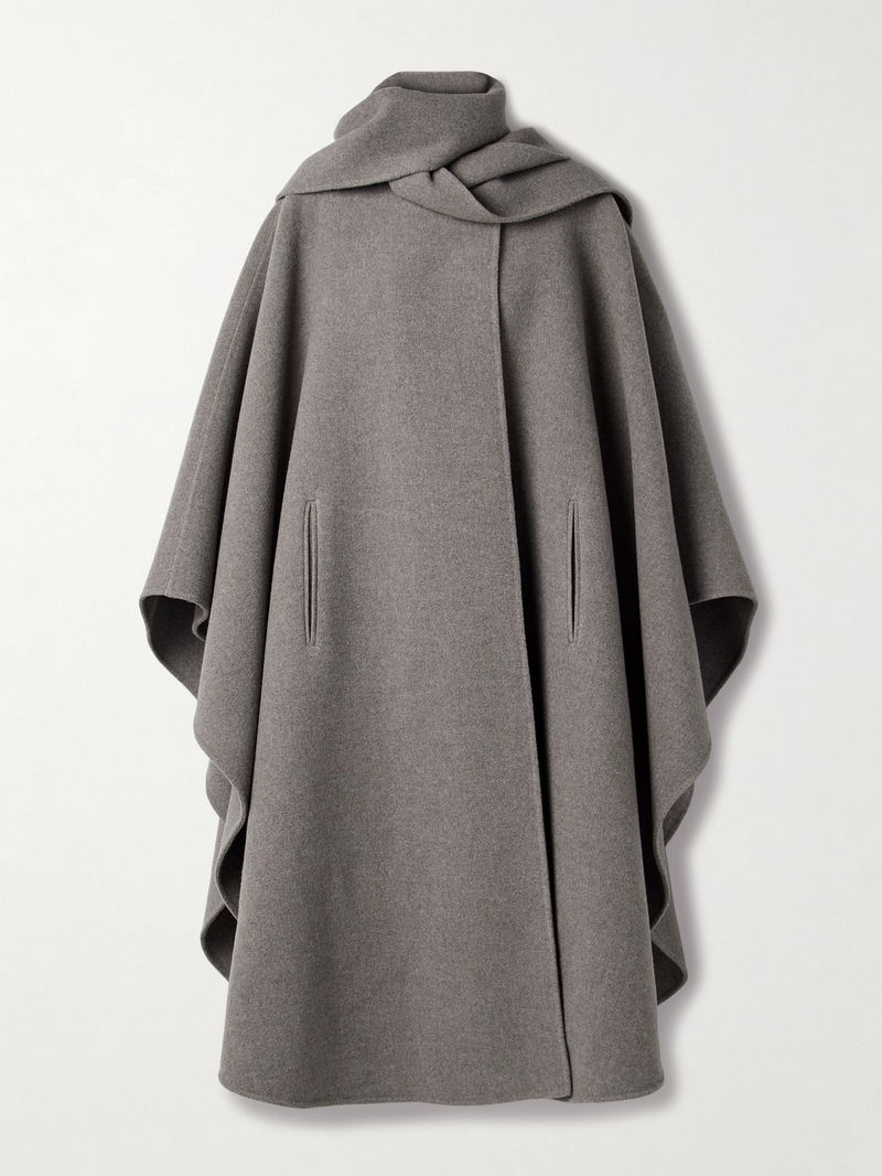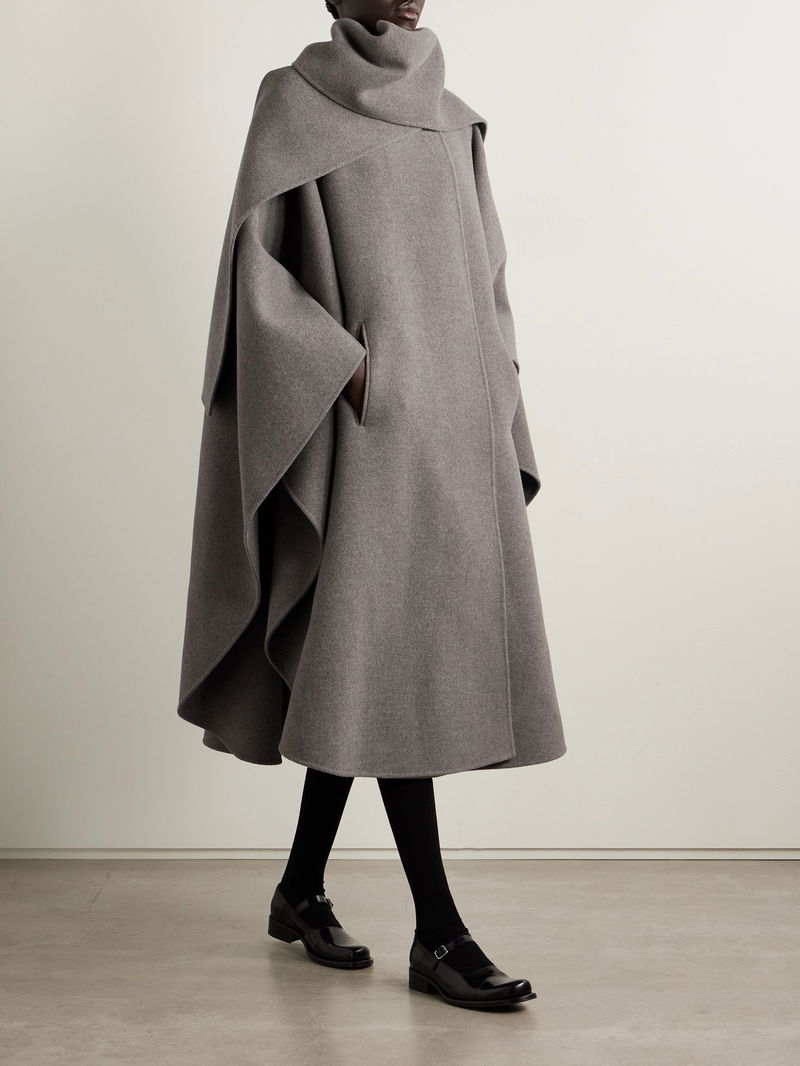 The Row's Resort '26 collection is filled with cozy yet chic outerwear like this 'Justino' coat. Crafted from gray mélange wool, it has a loose fit with an attached scarf at the neck and wide sleeves that create a cape effect.