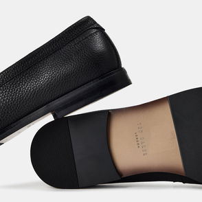 Hand-stitched vegetable-tanned grained calfskin slip-on loafers in black.· Moc toe· Pinched seam at heel counter · Suede lining· Treaded rubber sole.