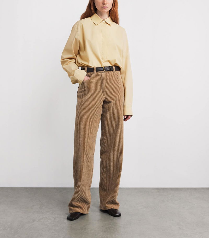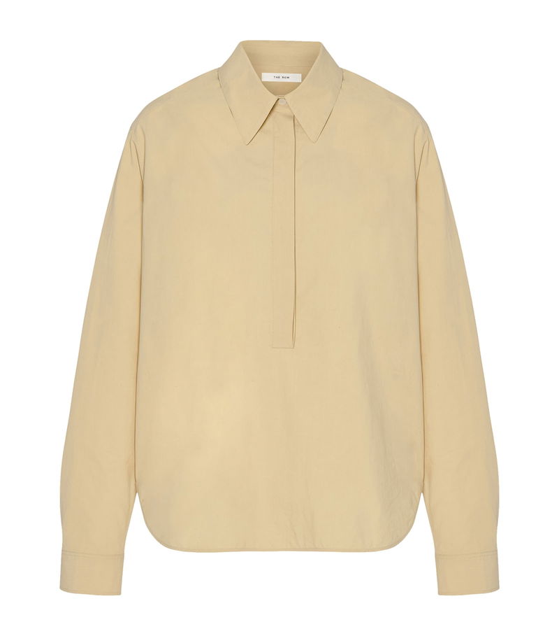A considered addition to the modern wardrobe, The Row's cotton poplin Margan shirt makes its new-season debut. Drawing inspiration from a traditional polo shirt, the long-sleeve silhouette is refined with a concealed button placket and a softly nuanced sand hue, while a sharp collar lends a tailored sign-off.