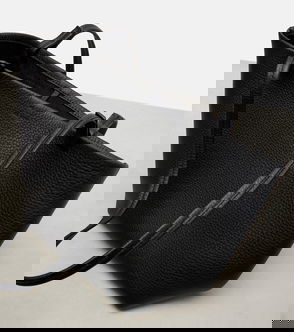 Grained calfskin tote in black. · Fixed shoulder strap· Logo embossed at face· Self-tie fastening at open throat· Suede lining·
