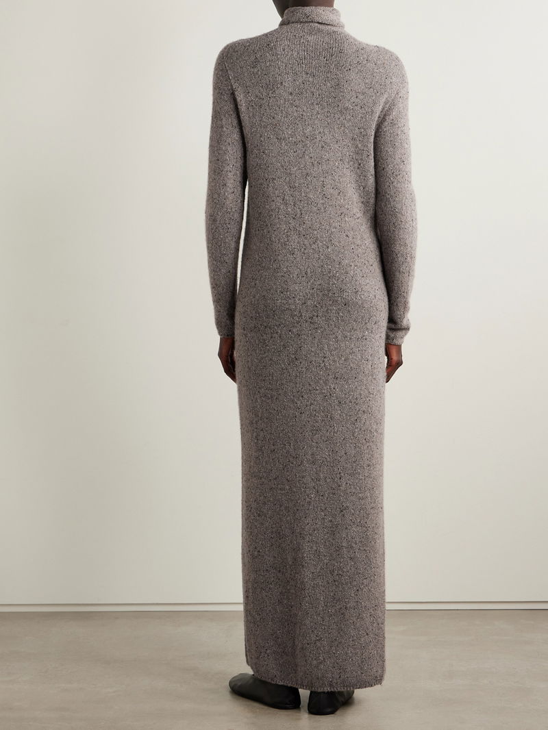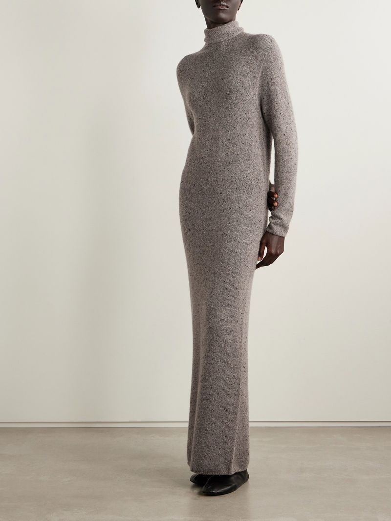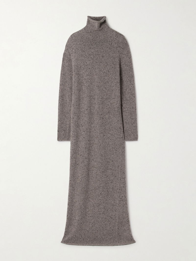 The Row’s ‘Melani’ dress translates the ease of your favorite sweater into an elegant silhouette. Knitted from speckled cashmere, it has dropped shoulders, a relaxed fit and chic turtleneck. Balance the floor-grazing hem with heeled boots.