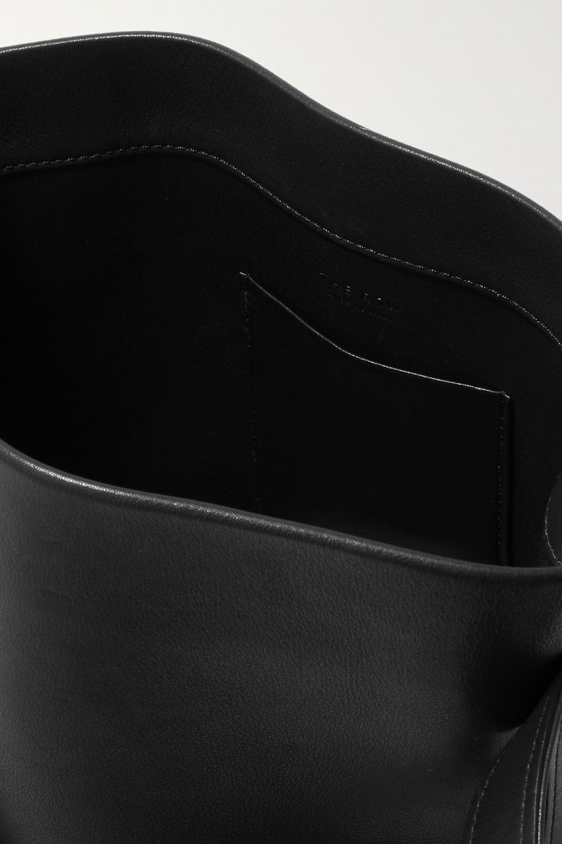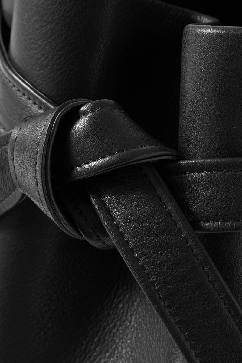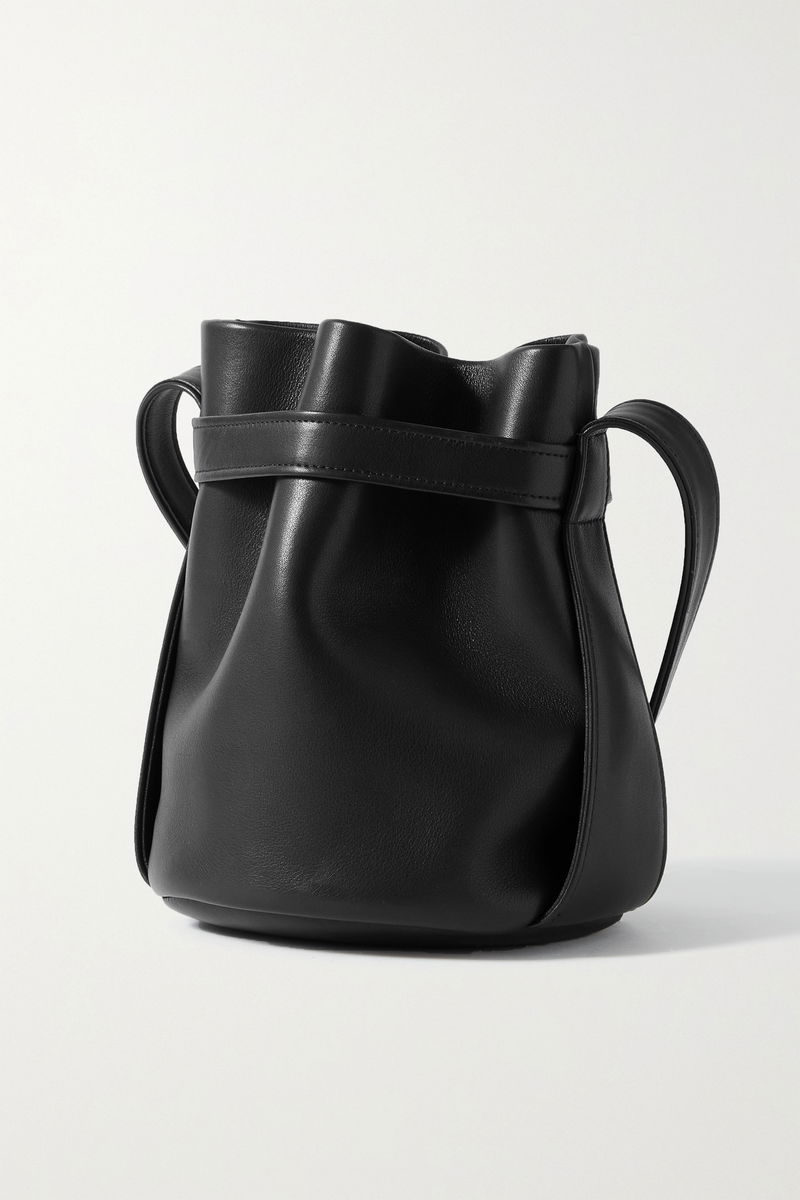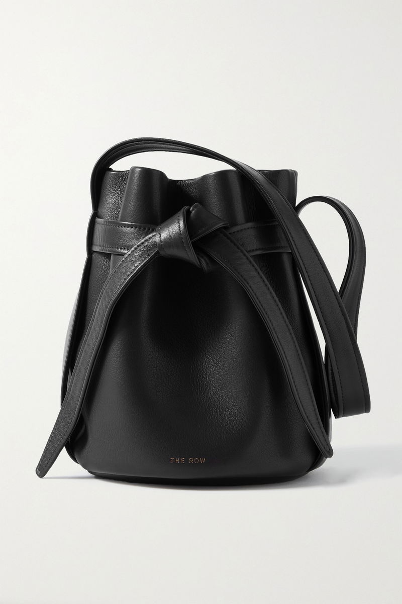 The Row's 'Mini Leo' shoulder bag is designed in a slouchy bucket silhouette emphasized by a knotted strap along the open top. It's made from versatile black leather and has a single internal slip pocket. Stow your phone, cardholder and keys inside.