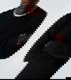 Knit wool sweater. Rib-knit V-neck, hem, and cuffs.