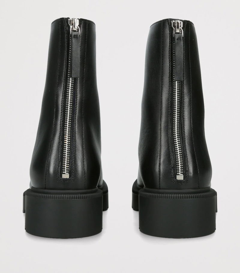 That commitment to refinement informs every piece today, including this polished calfskin ankle boot. The smooth round toe and clean back zip keep the profile understated, while the treaded rubber platform sole introduces quiet durability to a silhouette defined by clarity and restraint.