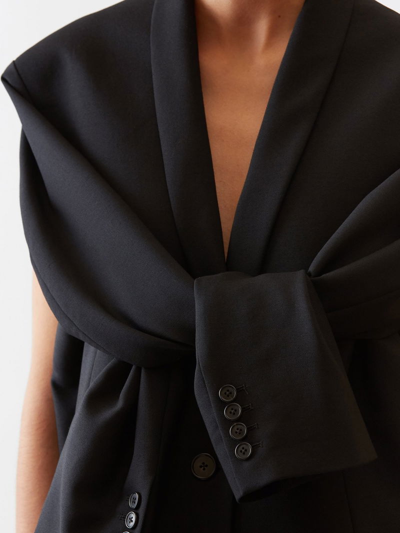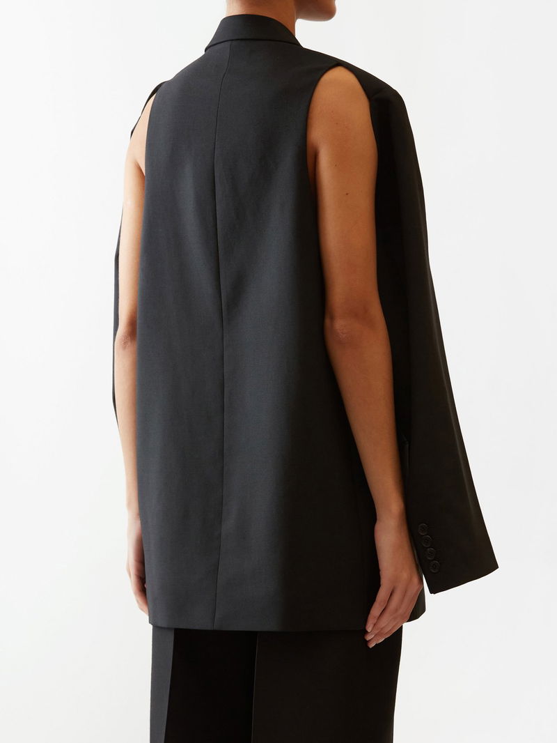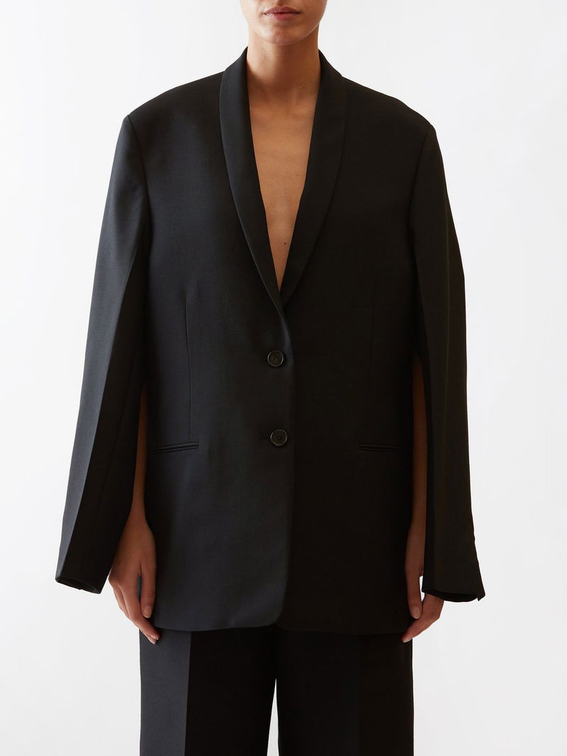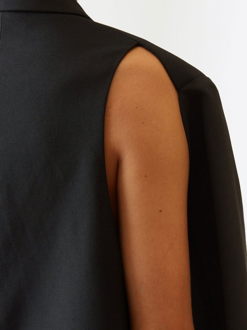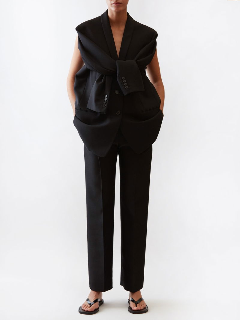 First seen at the Pre-AW23 show, The Row’s black jacket has slit armholes that allows the single-breasted silhouette to be worn as a vest.