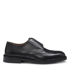 Suede derbys in black.· Moc toe· Lace-up closure· Shearling lining· Pinched seam at welt· Treaded rubber sole.