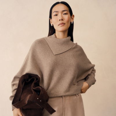 It's all about the refined details. Knitted on the horizontal with an asymmetric foldover neckline this jumper has an easy slightly cropped shape and a lovely drape in the body. Tight ribbing at the cuffs creates a subtle blouson effect through the sleeve. Light elegant and effortless ideal to pair with smart trousers.