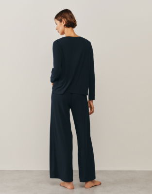 A set so comfortable to wear it bridges the gap between loungewear and nightwear. Ultra-soft and slouchy with an all-over fine rib that makes it feel even cosier. The trousers have a sleek elasticated waistband and wide leg while the top has a relaxed and flattering scooped neckline and long sleeves.