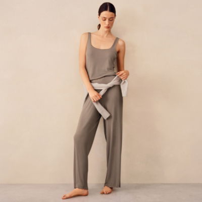 Soft and drapey our jersey pyjama set is made from ECOVERO™ viscose with a very fine rib for a drapey feel with a nice weight ideal for bedtime comfort. We've paired the sleeveless top with long bottoms so you have plenty of coverage but can still feel cool. There's a glossy satin trim along the neckline and the arm holes front and back and pretty lettuce edging on the hems.