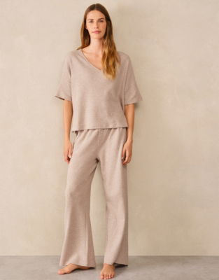 Your new ultra-cosy nightwear set - also great for relaxed weekend mornings at home or quiet evenings curled up on the sofa. It's the cosy waffle texture that makes these PJs so soft and delightful to wear but we love the modern outline of them too - a boxy V-neck top with relaxed dropped shoulders and short sleeves with easy roomy trousers and an elasticated wait and a faux-fly detail.