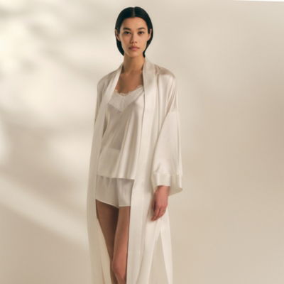 Designed to be worn with our pure-silk pyjamas and nighties this elegant silk robe is maxi length and features a piped shawl collar and wide sleeves. With a self-tie fabric belt this sophisticated style can be cinched in for a flattering silhouette. Add a silk eye mask for the full luxe experience. The ivory colourway makes a lovely bridal option too. All our silk nightwear is a luxurious 19 momme. Momme refers to the weight of silk - the higher the momme the heavier and more premium the silk.