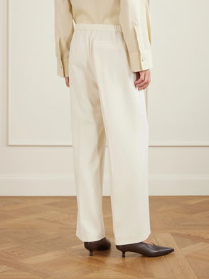 Wide-leg pants, Crepe, Pressed creases, Two side slit pockets, Back slit pocket, Two side flap pockets, High-rise cut, Button and concealed zip fastening at front, Mid-weight, slightly stretchy fabric.