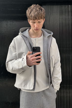 Stretch virgin wool twill jacket. Breathable, moisture-wicking, and anti-odor.· Spread collar · Zip closure · Welt pockets · Single-button barrel cuffs· Partial satin lining.