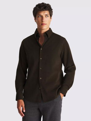 Rib knit extra fine merino wool-blend shirt. · Spread collar · Button closure · Shirttail hem · Single-button barrel cuffs · Mother-of-pearl hardware.