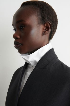 Theory's jacket has a generous ribbed collar that lays flat on the shoulders when unzipped. It's made from wool-blend twill and features utilitarian pockets.