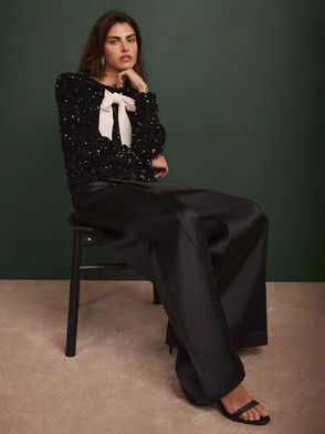 Jacket, Satin, Sequins, Two front patch pockets, Snap fastenings through front, Fully lined, Mid-weight, heavily embellished fabric.