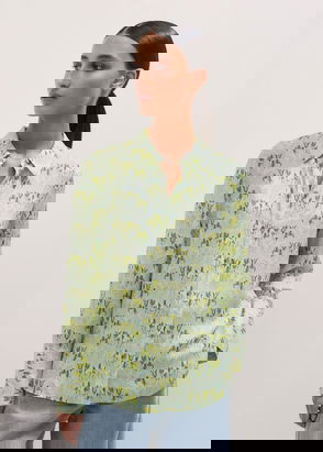 Shirt, Silk, Pleated back, Buttoned cuffs, Side slit hemline, Button fastenings through front, Mid-weight, non-stretchy fabric.