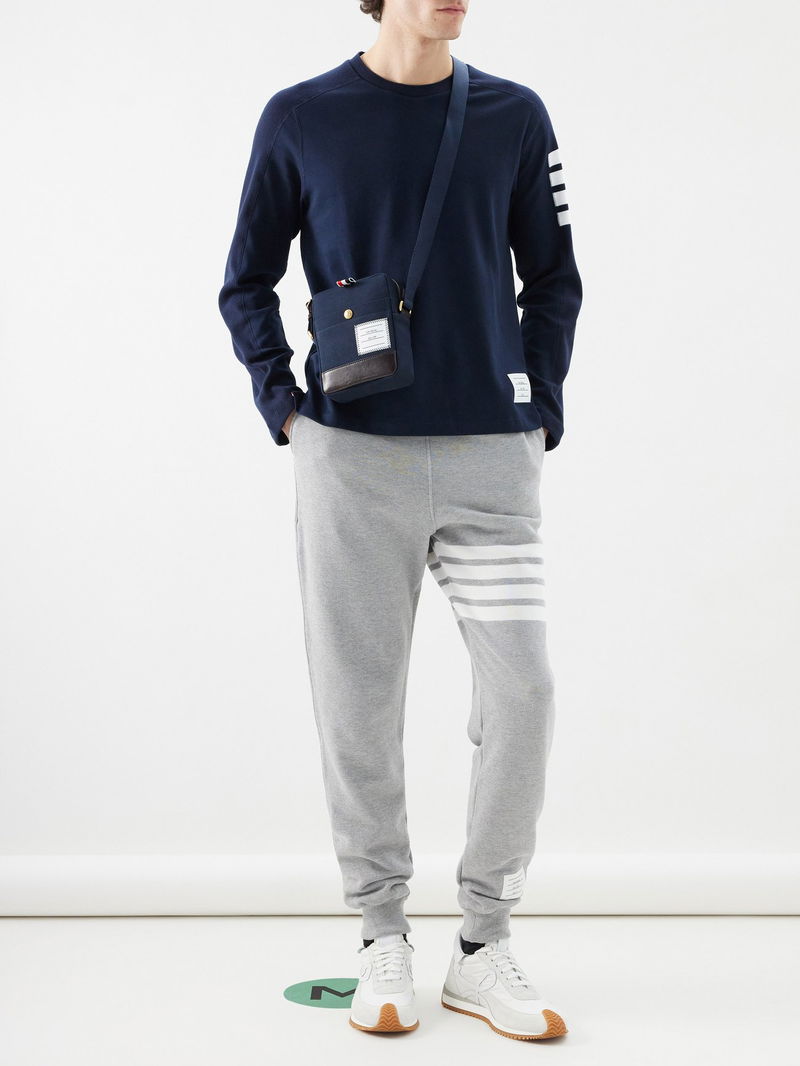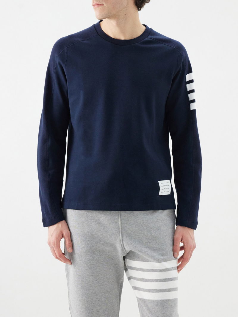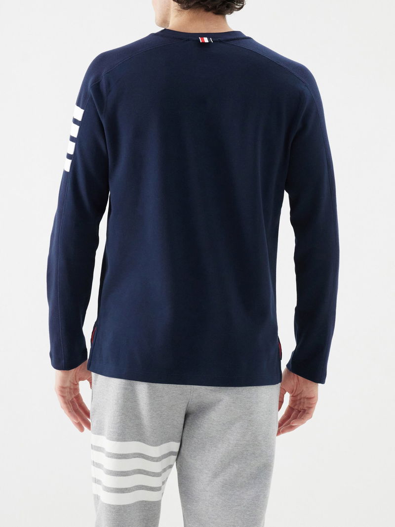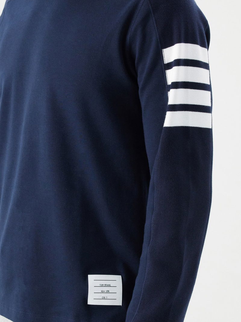 Defined by Thom Browne’s signature 4-bar stripes, this navy long-sleeved T-shirt is crafted in Japan from soft cotton jersey.