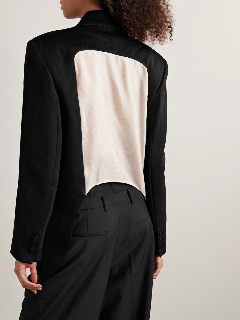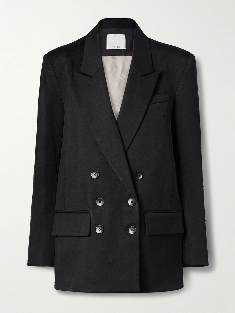 Tibi's double-breasted blazer is tailored to perfection from wool-blend twill with a slightly slubby texture. There's an unexpected cutout at the back, which reveals a contrasting silk-organza panel. The padded shoulders add structure.