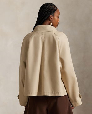 Tibi’s jacket strikes a balance between utilitarian structure and refined detail. Cut from bonded twill, it’s topped with a contrasting leather collar and has four patch pockets.