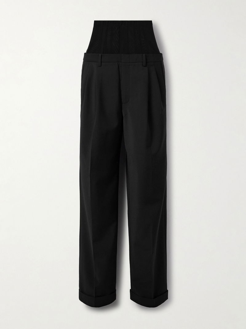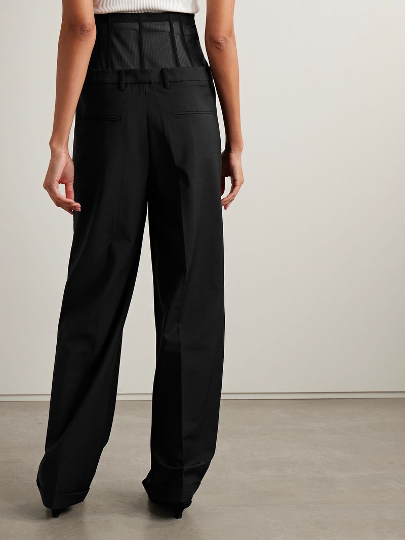 Tibi's black crepe pants fuse sharp tailoring with unexpected structure. The ultra high mesh waistband, reinforced with corset-inspired boning, sculpts the waist while adding edge.