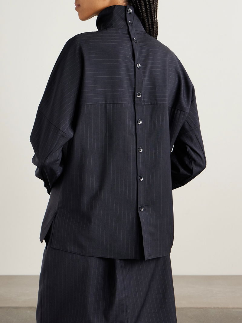 A fresh interpretation of classic shirting, Tibi's 'Mier' top is unexpectedly designed with buttons through the back. It's made from panels of pinstriped wool-blend and has a turtleneck and dropped shoulder seams. Wear yours with the coordinating skirt in our edit.