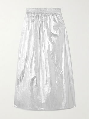 Tibi's skirt is lightly ruched at the waist and has a single cascading ruffle along the side. It's cut from glossy black nylon and hits just above the ankle.